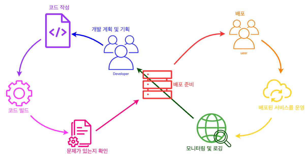 DevOps란 개발과 운영의 합성어로 개발팀과 운영팀이 협업하여 개발부터 배포까지의 과정을 자동화하고, 사용자에게 빠르고 안전하게 서비스를 제공하는 프로세스, 방법, 문화 등을 의미